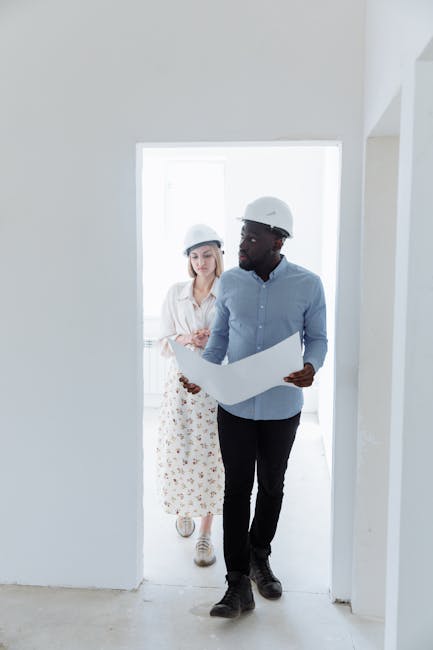 Two architects in hard hats reviewing blueprints inside a modern building.